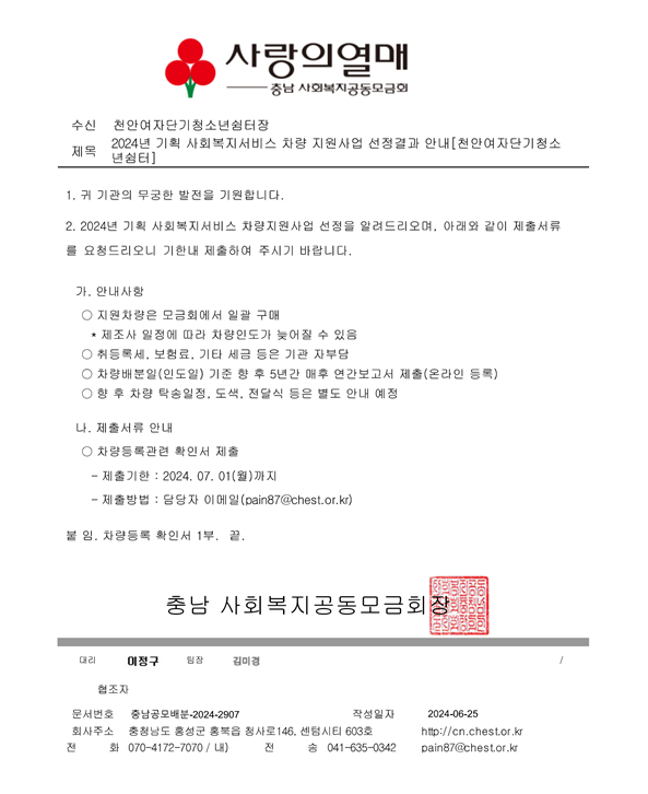[Ãæ³²»çȸº¹Áö°øµ¿¸ð±Ýȸ] 2024³â ±âȹ »çȸº¹Áö¼ºñ½º Â÷·® Áö¿ø»ç¾÷ ¼±Á¤
