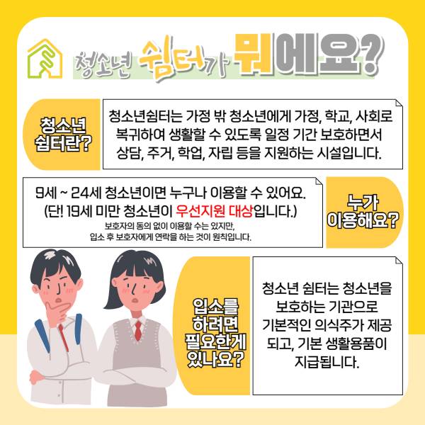 õ¾È¿©Àڴܱâû¼Ò³â½°ÅÍ´Â °¡Á¤ ¹Û û¼Ò³âÀ¸·Î, 9¼¼ ~ 24¼¼ û¼Ò³â(19¼¼ ¹Ì¸¸ û¼Ò³â ¿ì¼± Áö¿ø)À» º¸È£ÇÏ¸é¼ »ó´ã, ÁÖ°Å, ÇнÀ, ÀÚ¸³ ¼ºñ½º¸¦ Á¦°øÇϰí ÀÖ½À´Ï´Ù.