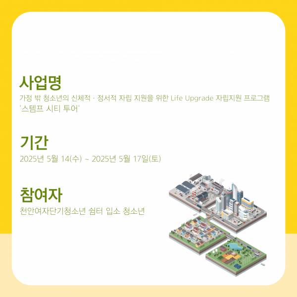º» »ç¾÷Àº û¼Ò³âµéÀÌ ´Ù¾çÇÑ µµ½Ã °ø°£À» Á÷Á¢ üÇèÇϰí Ž¹æÇÏ´Â °úÁ¤À» ÅëÇØ ÀÚ±âÀÌÇØ, »çȸÀû °ü°è È®Àå, ¹®Á¦Çذá´É·Â Çâ»ó µîÀ» üµæÇÒ ¼ö ÀÖµµ·Ï ±¸¼ºµÇ¾ú½À´Ï´Ù.