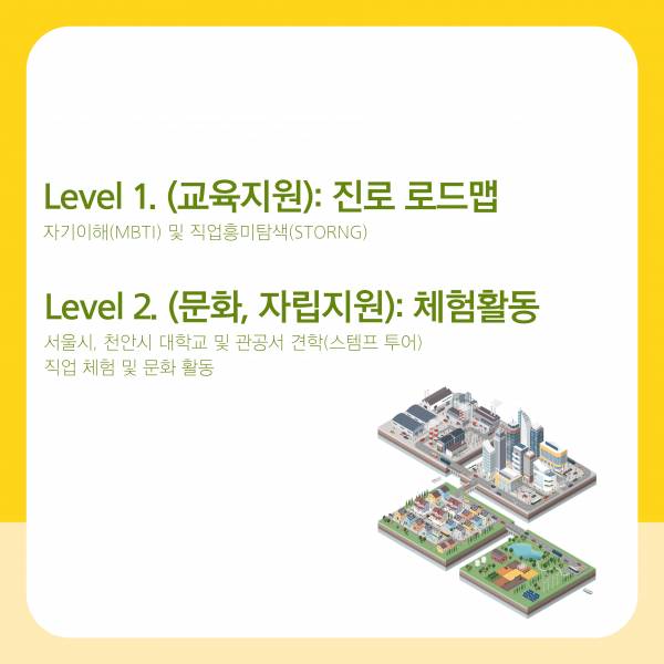 ÃÑ 2´Ü°è(Level 1~2)·Î ±¸¼ºµÈ ÇÁ·Î±×·¥Àº ¡ãÀÚ±âÀÌÇØ(MBTI) ¹× Á÷¾÷Èï¹ÌŽ»ö(STORNG), ¡ã¼¿ï½Ã, õ¾È½Ã ´ëÇб³ ¹× °ü°ø¼ °ßÇÐ(½ºÅÛÇÁ Åõ¾î), ¡ãÁ÷¾÷ üÇè ¹× ¹®È Ȱµ¿À¸·Î ÀÌ·ç¾îÁý´Ï´Ù.