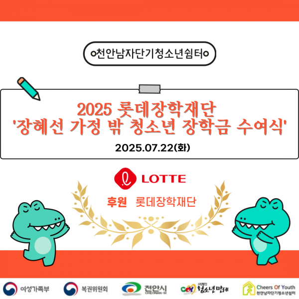 2025³â 7¿ù 22ÀÏ(È­) õ¾È³²Àڴܱâû¼Ò³â½°ÅÍ´Â ·Ôµ¥ÀåÇÐÀç´Ü 2025³â ¡®ÀåÇý¼± °¡Á¤ ¹Û û¼Ò³â ÀåÇÐ±Ý Áö¿ø»ç¾÷¡¯¿¡ ÃÖÁ¾ ¼±¹ßµÇ¾î, 200¸¸¿øÀÇ ÀåÇбÝÀ» Áö¿ø¹Þ°Ô µÇ¾ú½À´Ï´Ù.