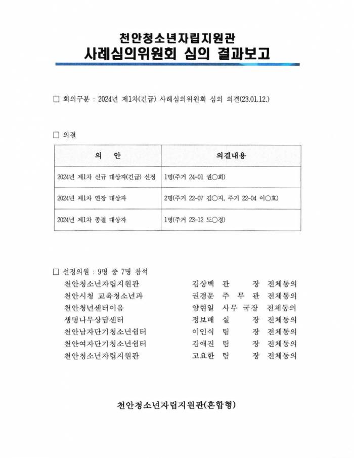 2024³â Á¦1Â÷(±ä±Þ) õ¾Èû¼Ò³âÀÚ¸³Áö¿ø°ü(È¥ÇÕÇü) »ç·Ê½ÉÀÇÀ§¿øÈ¸ ½ÉÀÇ °á°úº¸°í