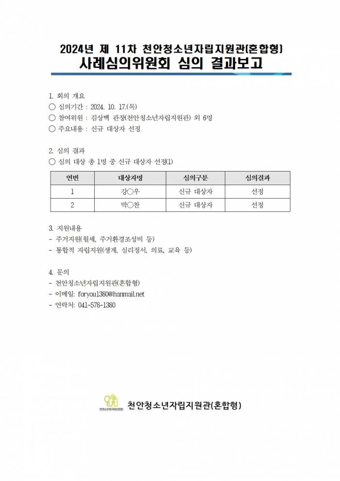 2024³â Á¦11Â÷(±ä±Þ) õ¾Èû¼Ò³âÀÚ¸³Áö¿ø°ü(È¥ÇÕÇü) »ç·Ê½ÉÀÇÀ§¿øÈ¸ ½ÉÀÇ °á°úº¸°í
