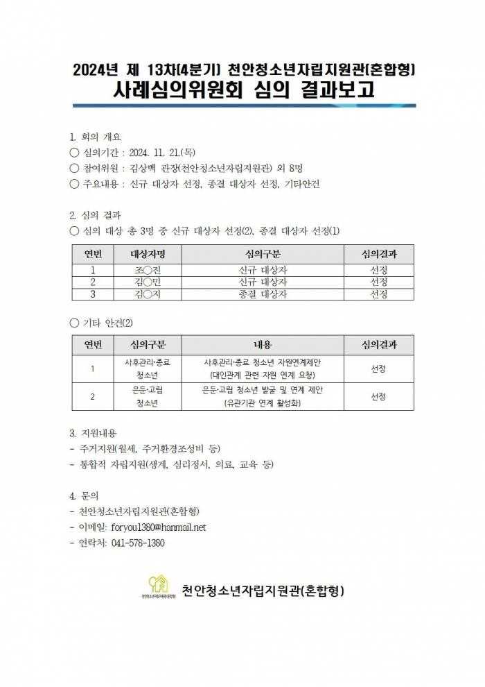 2024³â Á¦13Â÷(4ºÐ±â) õ¾Èû¼Ò³âÀÚ¸³Áö¿ø°ü(È¥ÇÕÇü) »ç·Ê½ÉÀÇÀ§¿øÈ¸ ½ÉÀÇ °á°úº¸°í