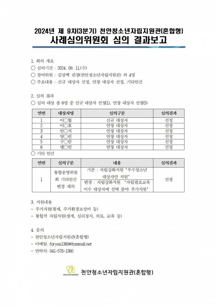 2024³â Á¦9Â÷(3ºÐ±â) õ¾Èû¼Ò³âÀÚ¸³Áö¿ø°ü(È¥ÇÕÇü) »ç·Ê½ÉÀÇÀ§¿øÈ¸ ½ÉÀÇ °á°úº¸°í