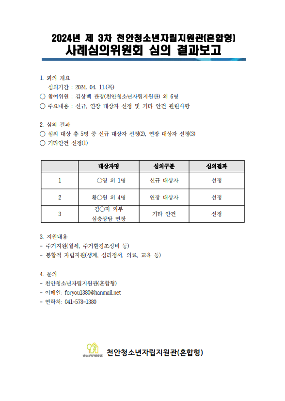 2024³â Á¦3Â÷(±ä±Þ) õ¾Èû¼Ò³âÀÚ¸³Áö¿ø°ü(È¥ÇÕÇü) »ç·Ê½ÉÀÇÀ§¿øÈ¸ ½ÉÀÇ °á°úº¸°í