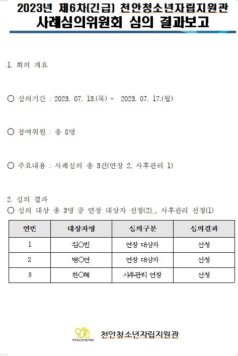 2023³â Á¦6Â÷(±ä±Þ) õ¾Èû¼Ò³âÀÚ¸³Áö¿ø°ü »ç·Ê½ÉÀÇÀ§¿øÈ¸ ½ÉÀÇ °á°úº¸°í